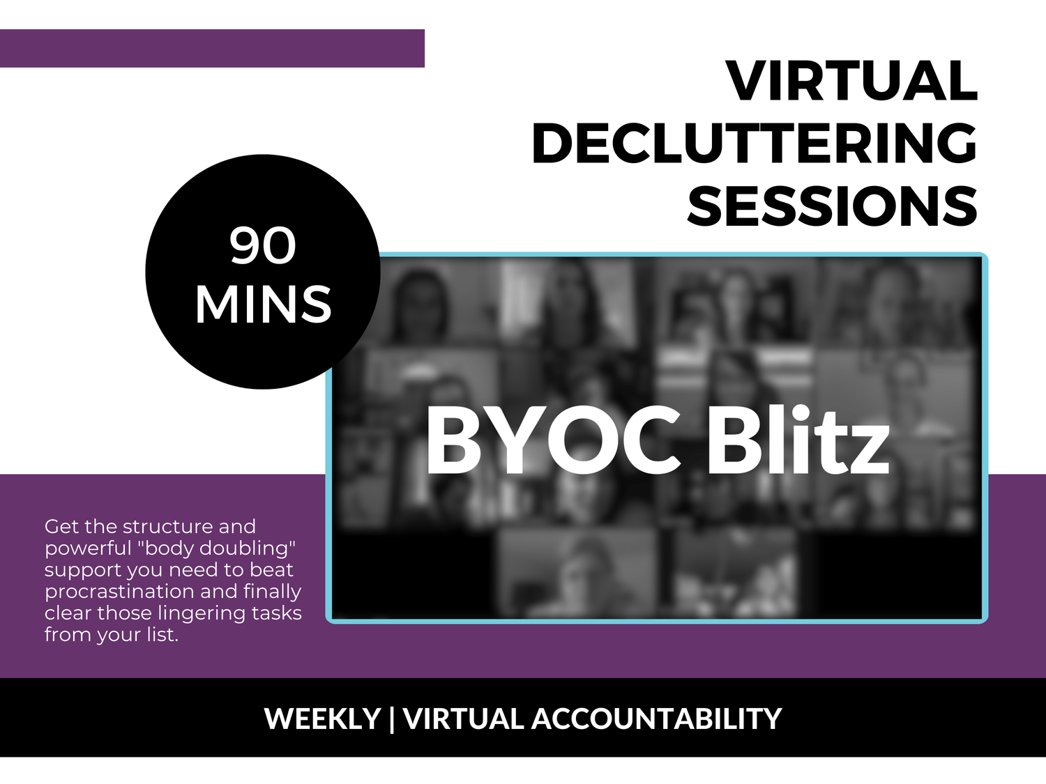 Get ongoing, weekly live accountability. Use body doubling to conquer procrastination and clear physical or digital clutter for the life of your membership.
